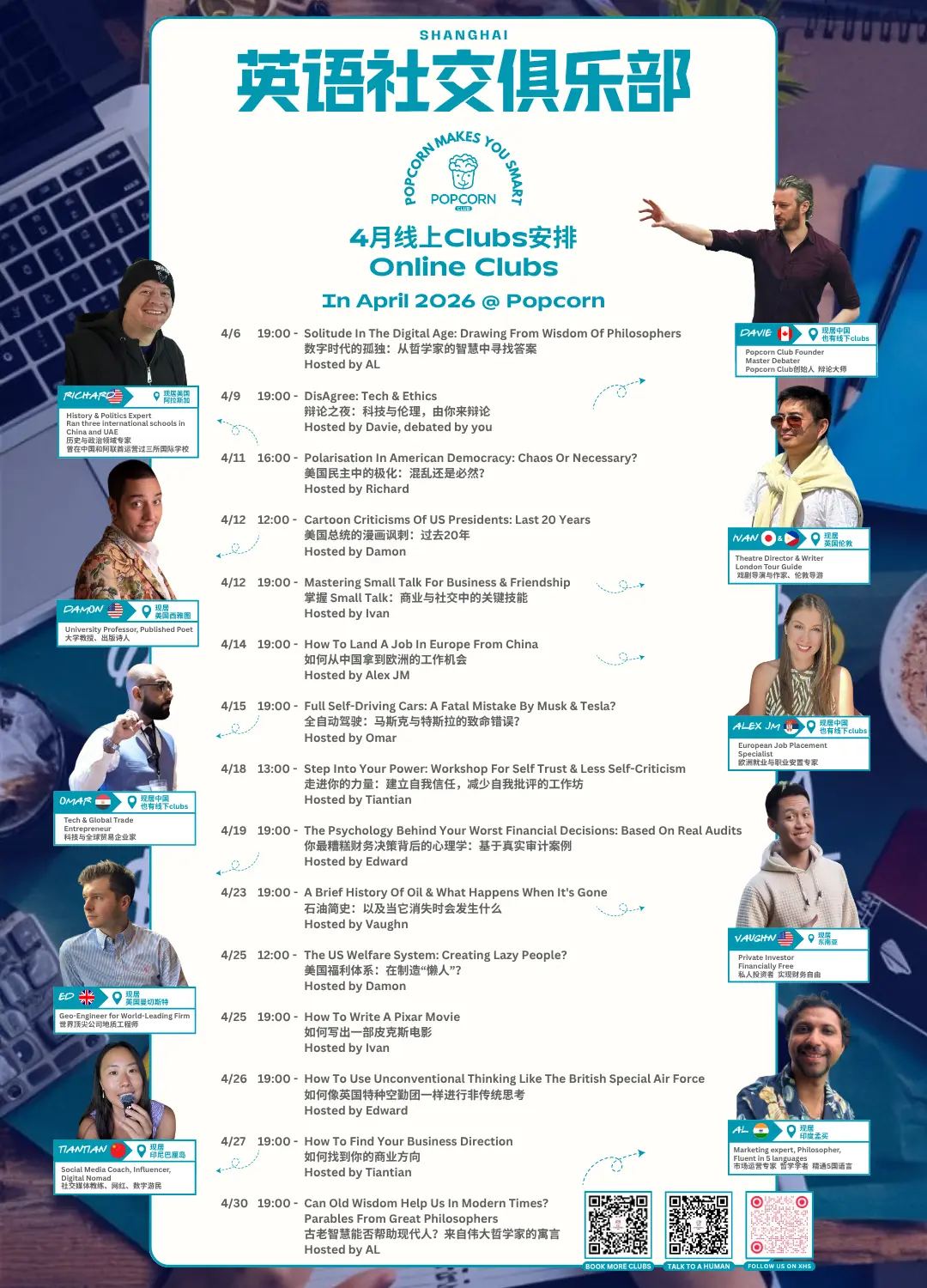 这些俱乐部由来自 美国、英国、法国、瑞典、瑞士、韩国、印度尼西亚 等不同地区的hosts实时带领讨论。同时,根据大家的热烈需求,一些非常受欢迎的 线下hosts 也会 从上海主持线上clubs