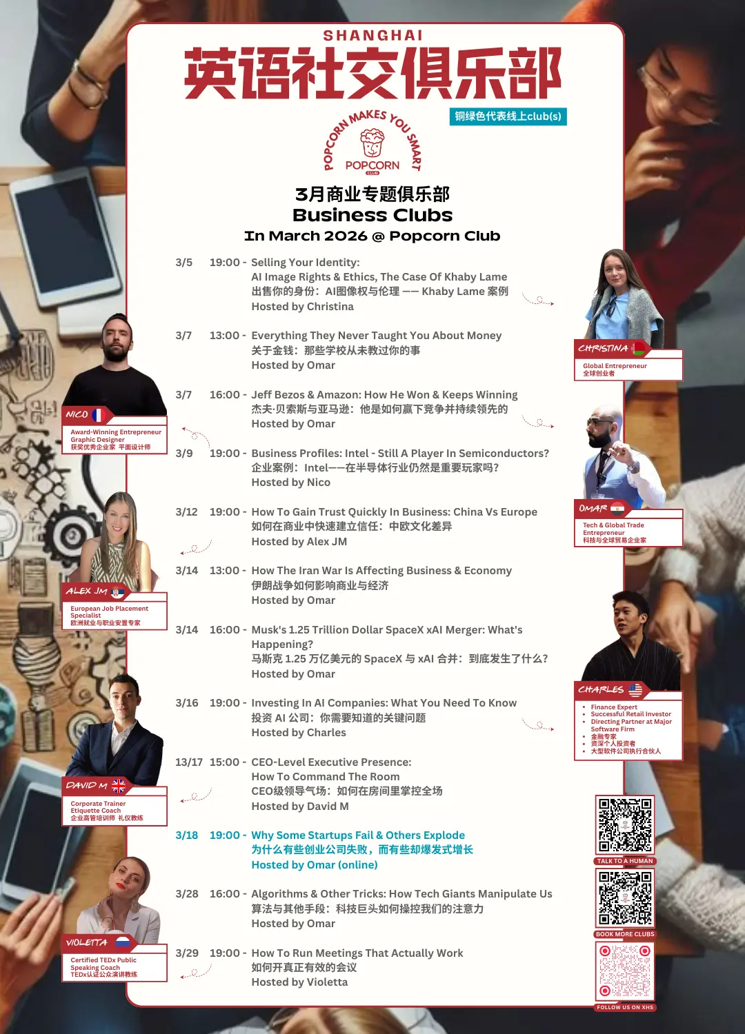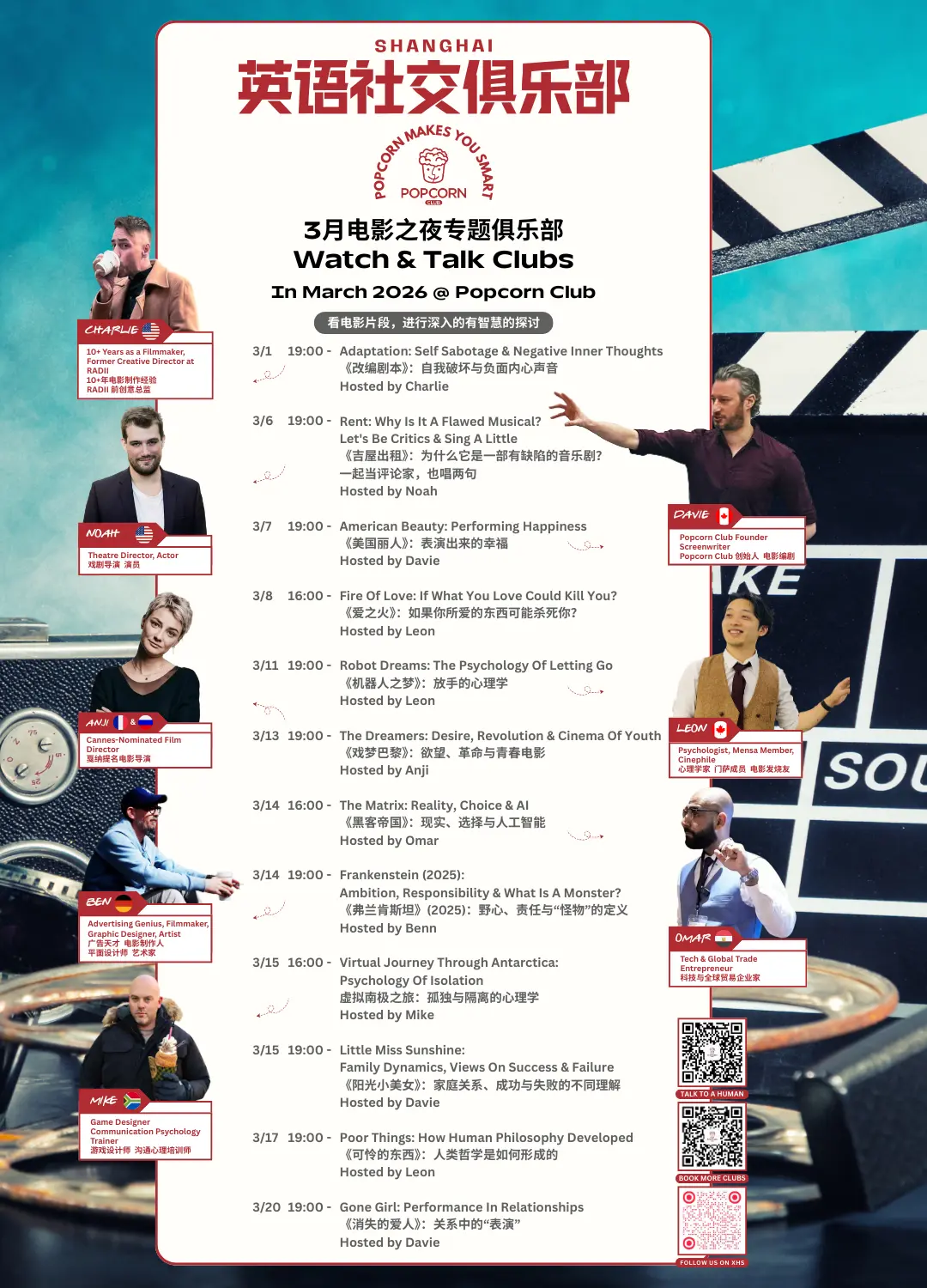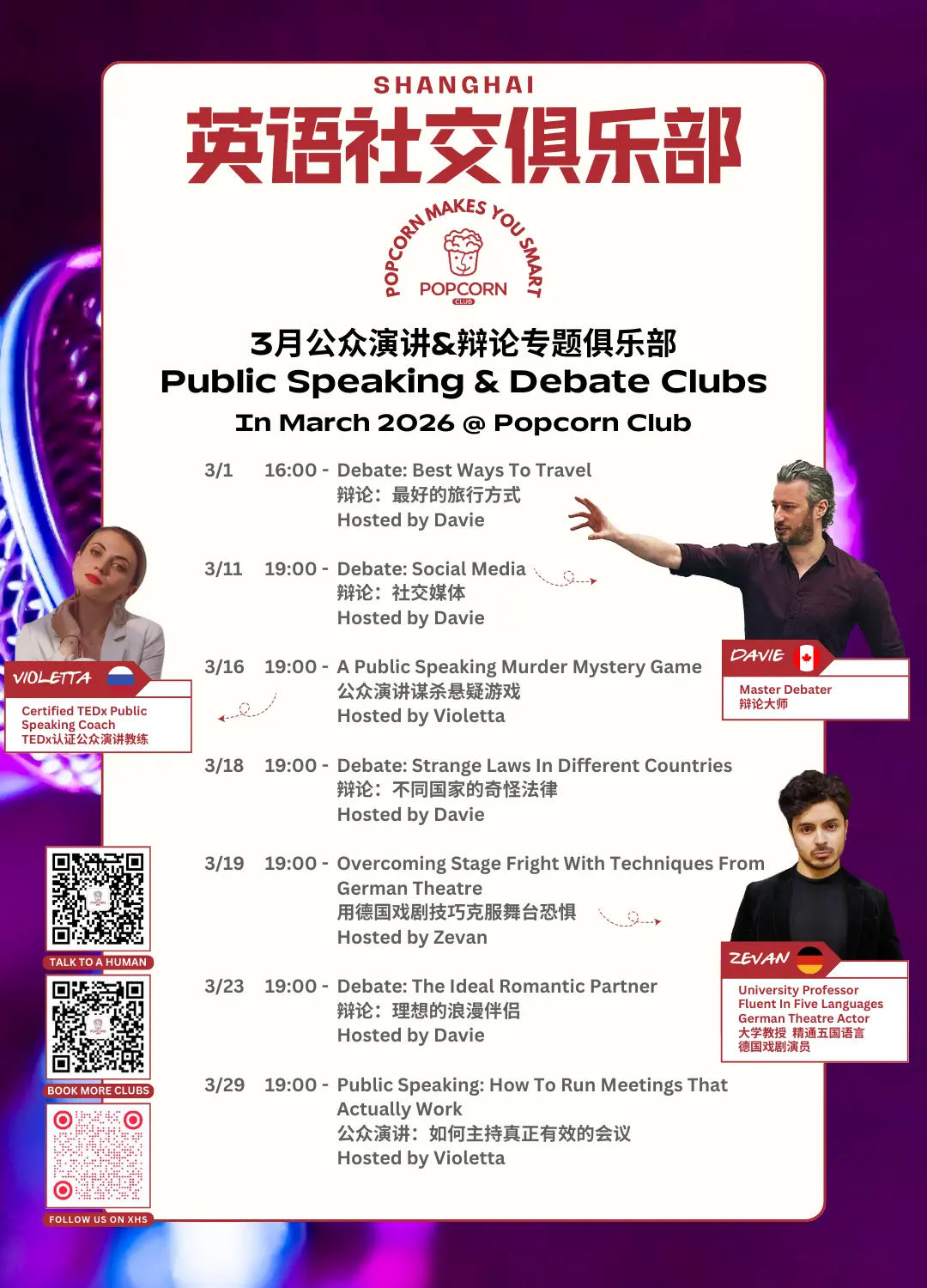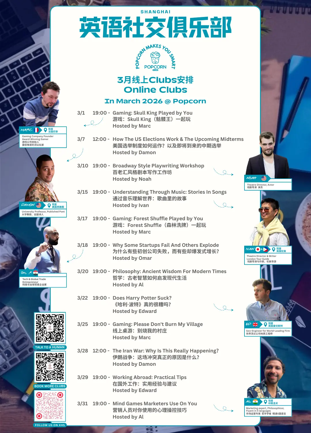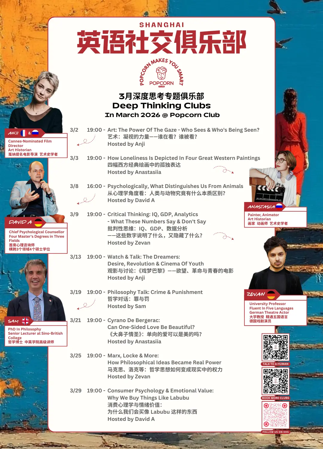 当然,3月的俱乐部远不止这些,我们只是提前给大家一点小小的剧透。还会有游戏、电影之夜、科技专题、音乐clubs、哲学、金融、商业,以及超有意思的specialty clubs,还有以及更多精彩等你来发现!